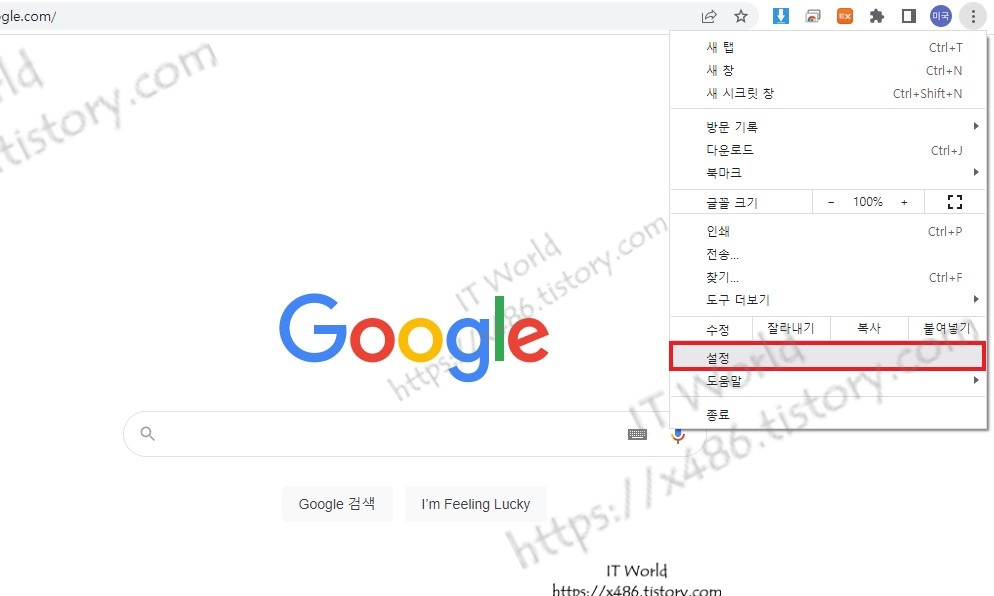 크롬 우측 상단에 "..."을 클릭하여 설정을 클릭.
