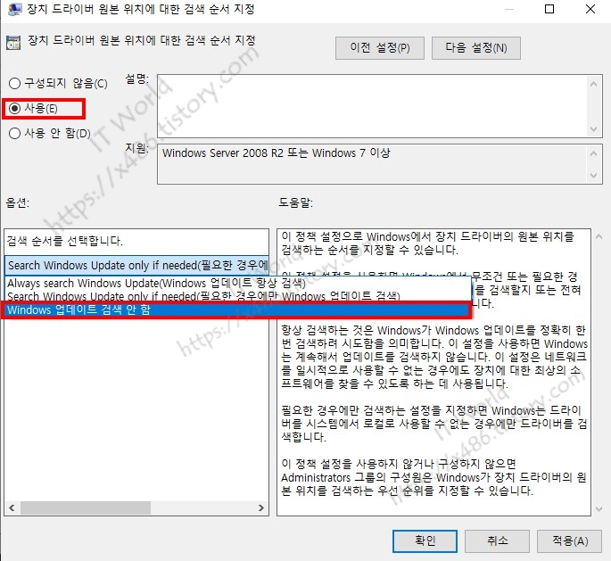 장치 드라이버 원본 위치에 대한 검색순서 지정 <사용>