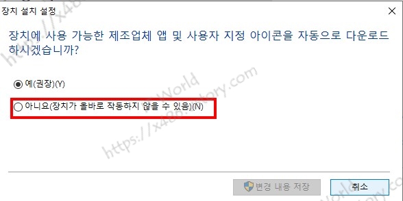 장치에 사용가능한 제조업체 앱 및 사용자 지정 아이콘을 자동으로 다운로드 <아니요>