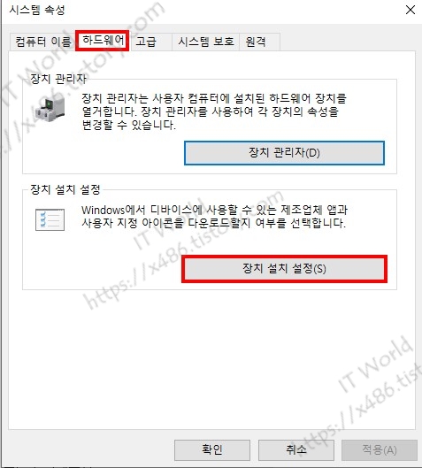 고급 시스템 설정 > 하드웨어 탭 > 장치 설치 설정