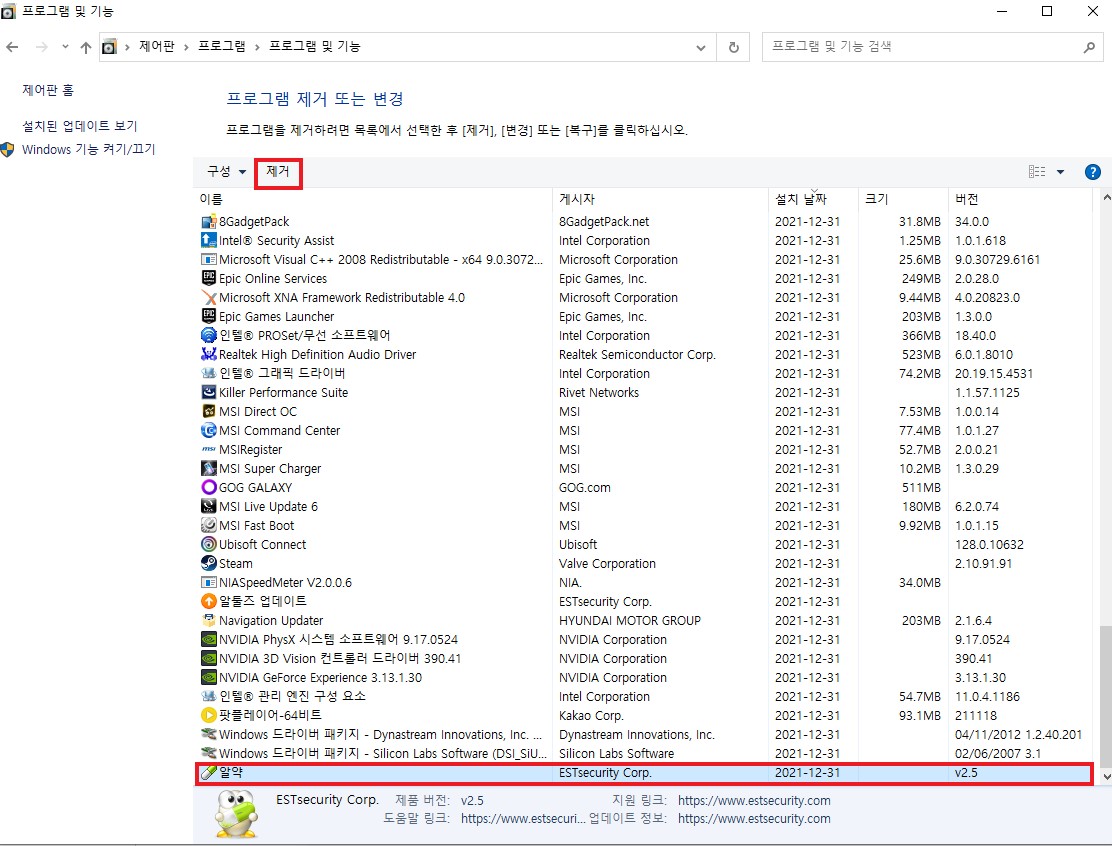제어판-프로그램 및 기능 - 알약삭제