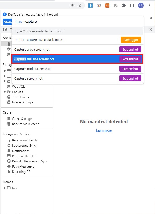 실행 창에서 Capture를 입력하면 하단에 Capture Full Size screenshot을 클릭