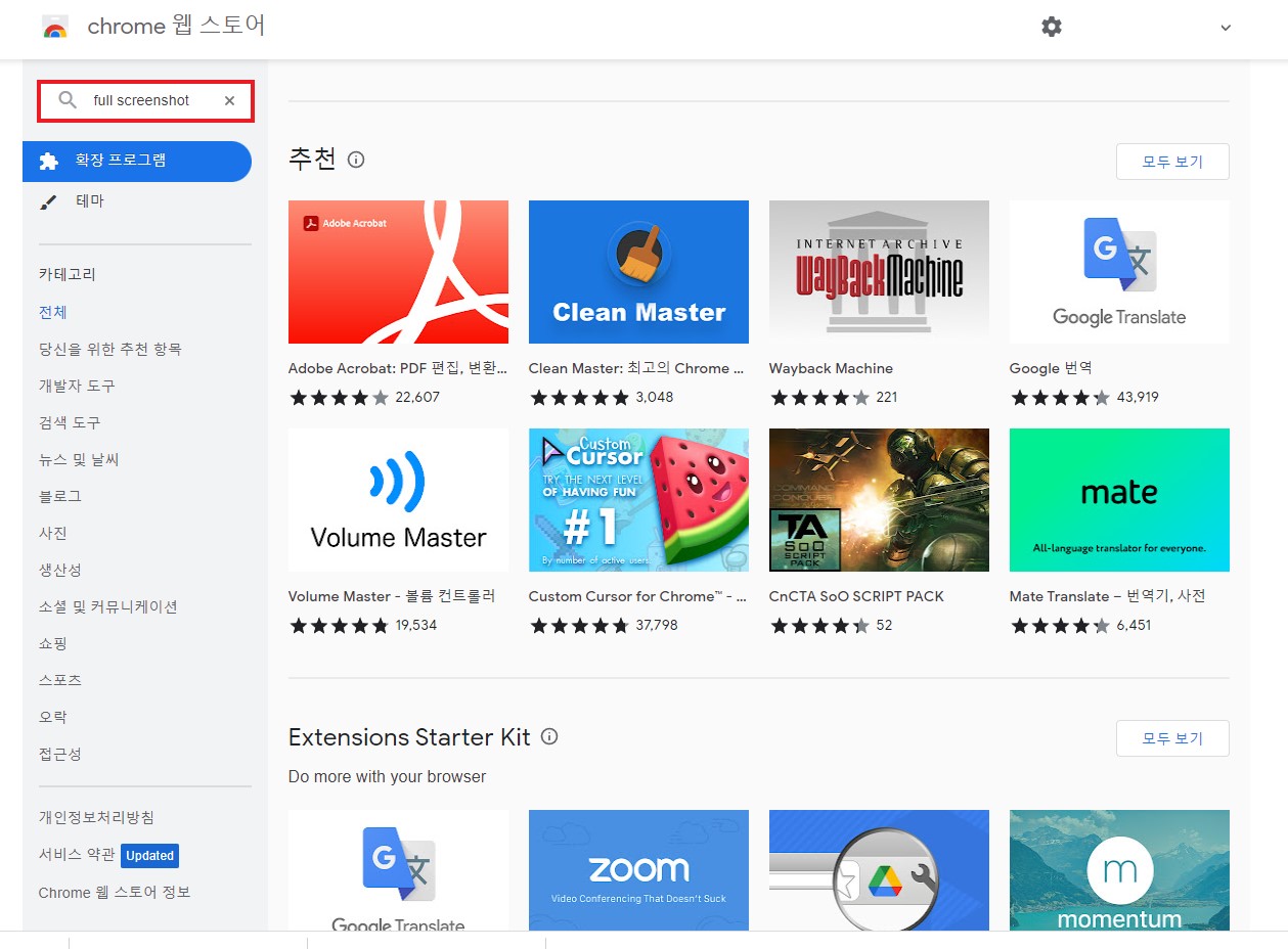 좌측 상단에 위치한 검색창에 full screenshot 검색을 합니다.