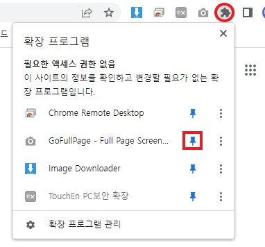 GoFullPage - Full Page Screen Capture 설치 후 주소창 옆에 있는 확장 프로그램 아이콘을 클릭하여