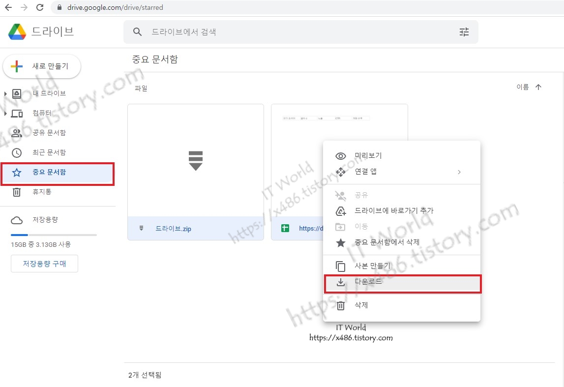 아무 파일이나 '중요 문서함'에 업로드 후 두 개 파일을 함께 묶어서 마우스 우클릭