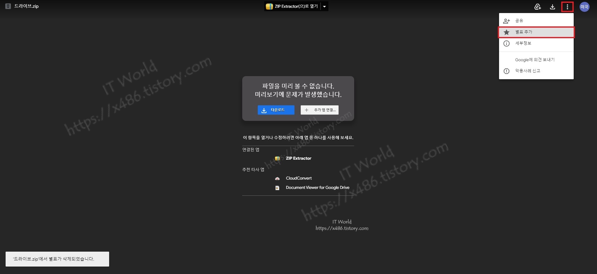 우측 상단의 더보기를 클릭하여 별표 추가를 해 줍니다.
