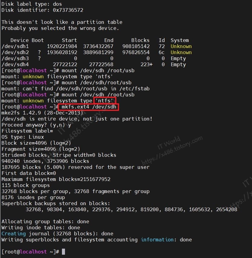 mkfs.ext4(공백)/dev/sdh(설치 된 디바이스)