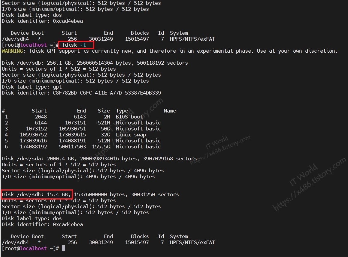 fdisk -l 로 디스크 인식과 디바이스 이름을 확인합니다.