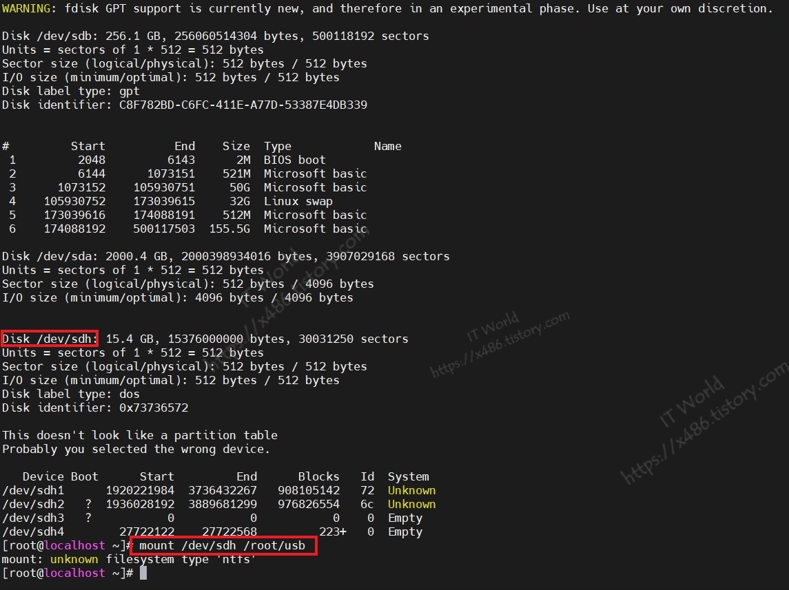 mount(공백)/dev/sdh(공백)/root/usb(마운트 할 폴더)