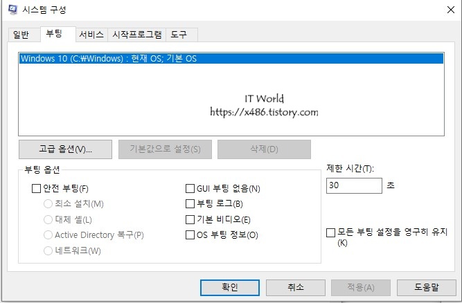 부팅 탭 선택 후 옵션에서 안전 부팅 체크