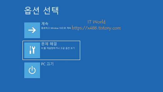 옵션 선택 화면 송출 후 '문제해결 > 고급 옵션 > 시작 설정 > 다시 시작'