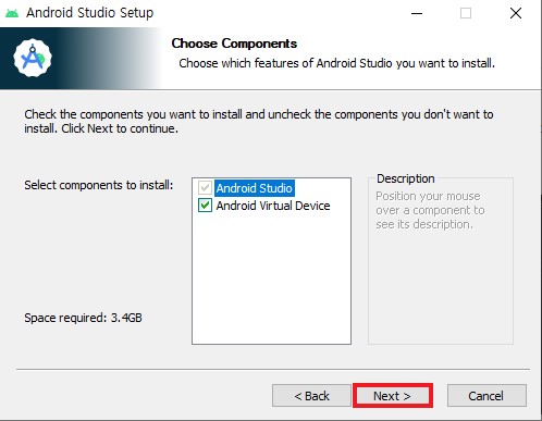 다운받은 파일을 실행하고 Next를 누르면 Android Virual Device란 항목이 나오는데