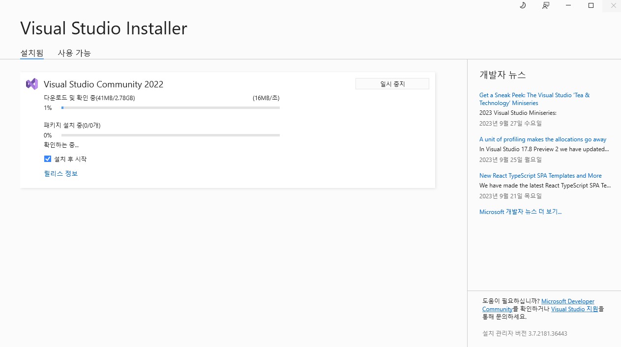 비주얼 스튜디오 홈페이지에서 커뮤니티 2022를 다운 받아 실행해 줍니다.