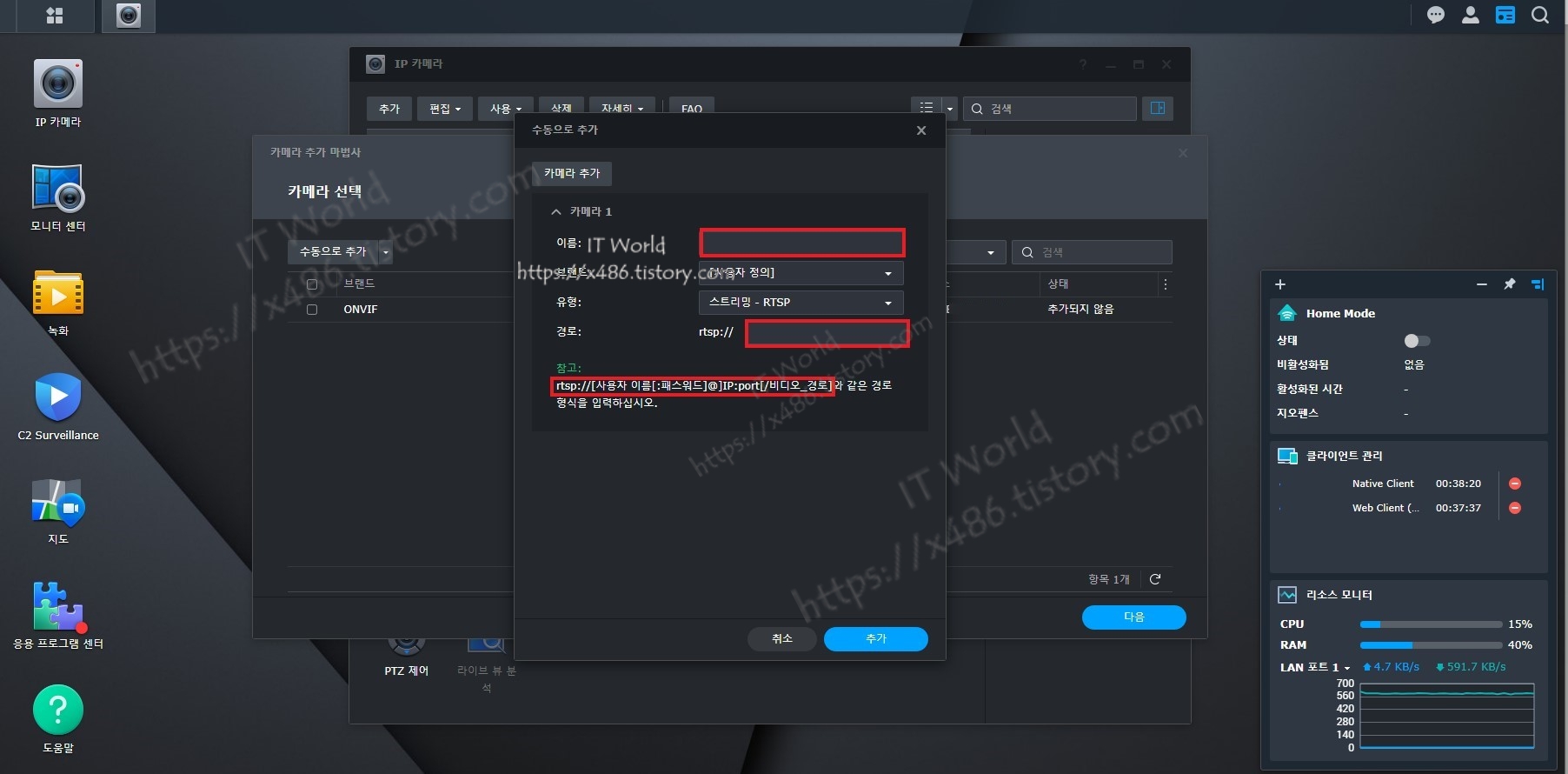 서베일런스 스테이션을 실행하면 'IP 카메라' 아이콘이 있고 클릭하여 추가해 주면 됩니다.