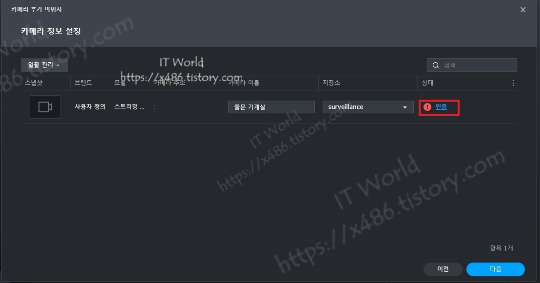 인증은 위에 언급했던 카메라 계정 생성한 것을 넣어 주시면 됩니다.