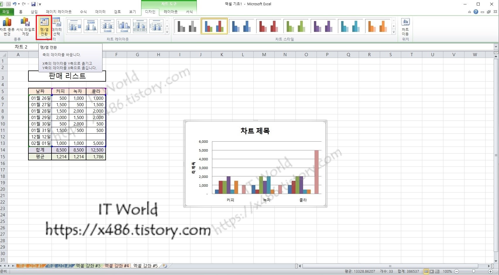 리본 메뉴를 보면 행/열 전환으로 정렬 기준을 변경 날짜 기준이 아닌 품목으로 변경 하였습니다.
