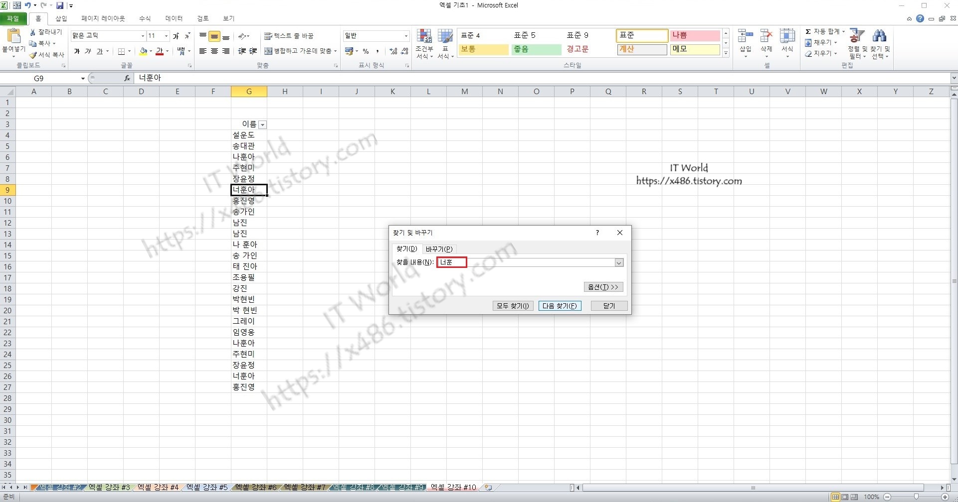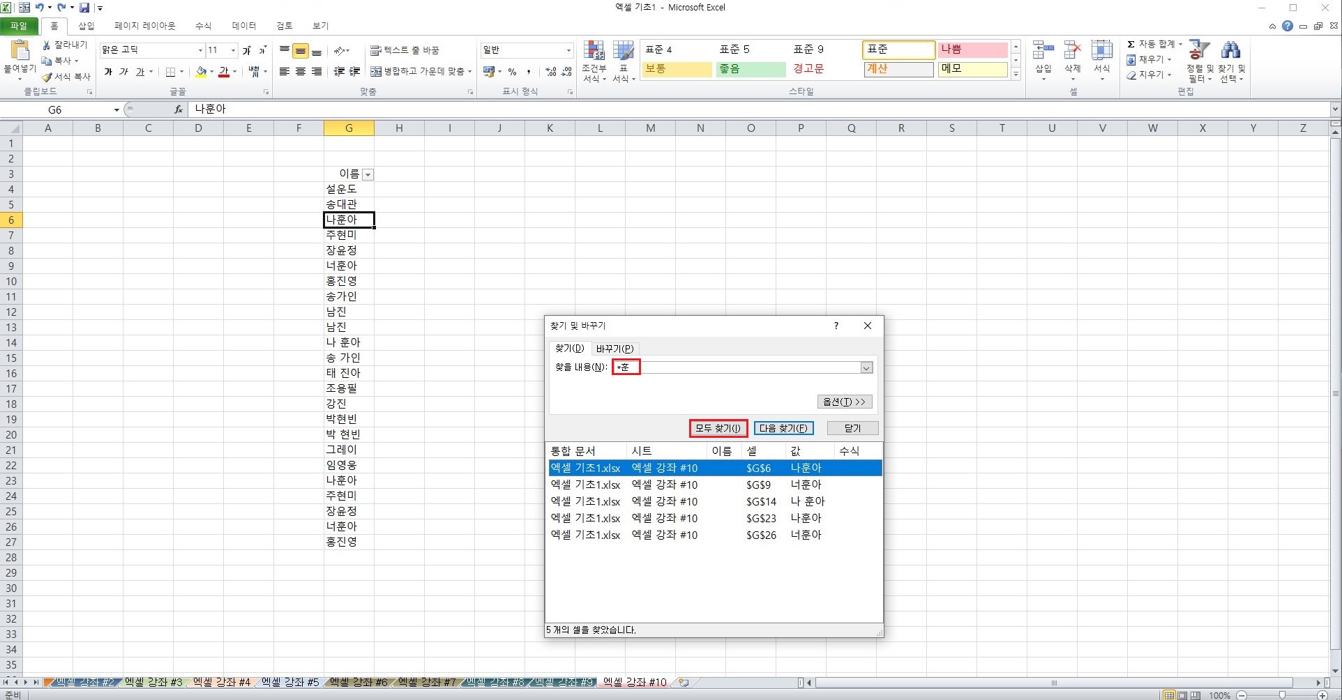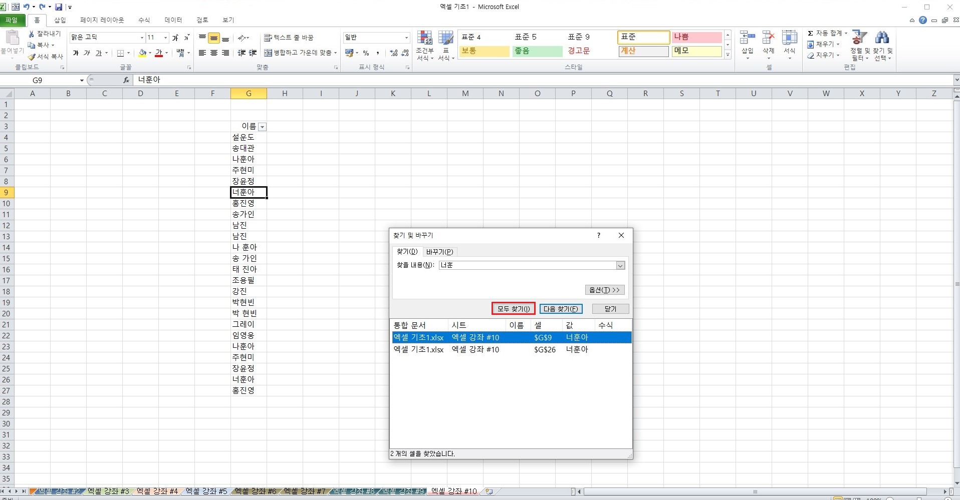 검색할 항목이 많을 경우 모두 찾기 버튼을 클릭하여 여러 셀을 찾을 수 있습니다.