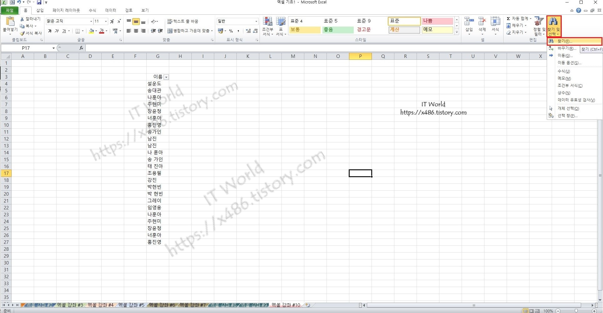 리본 메뉴에서 찾기 및 선택 항목을 클릭 후 찾기를 클릭