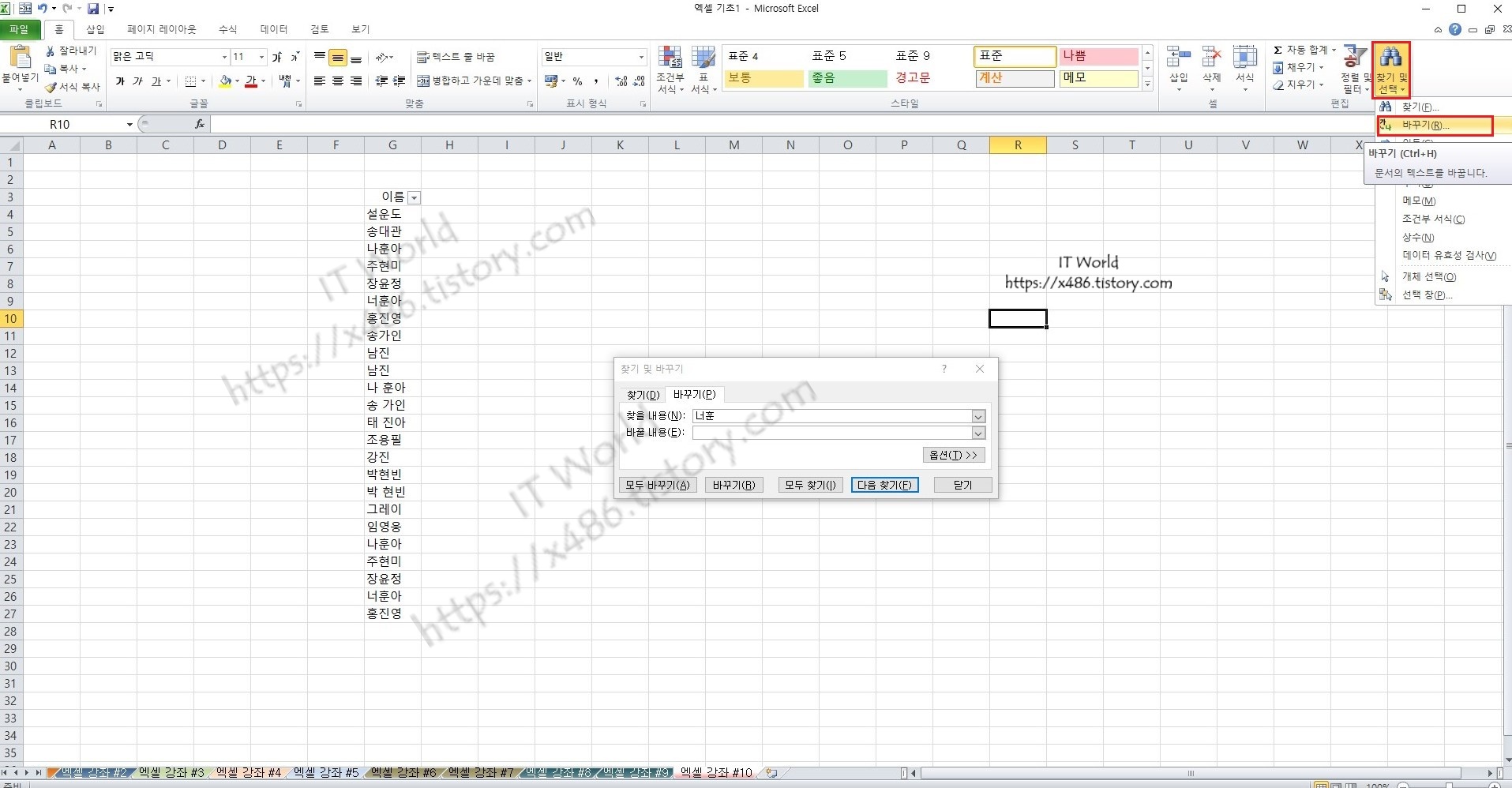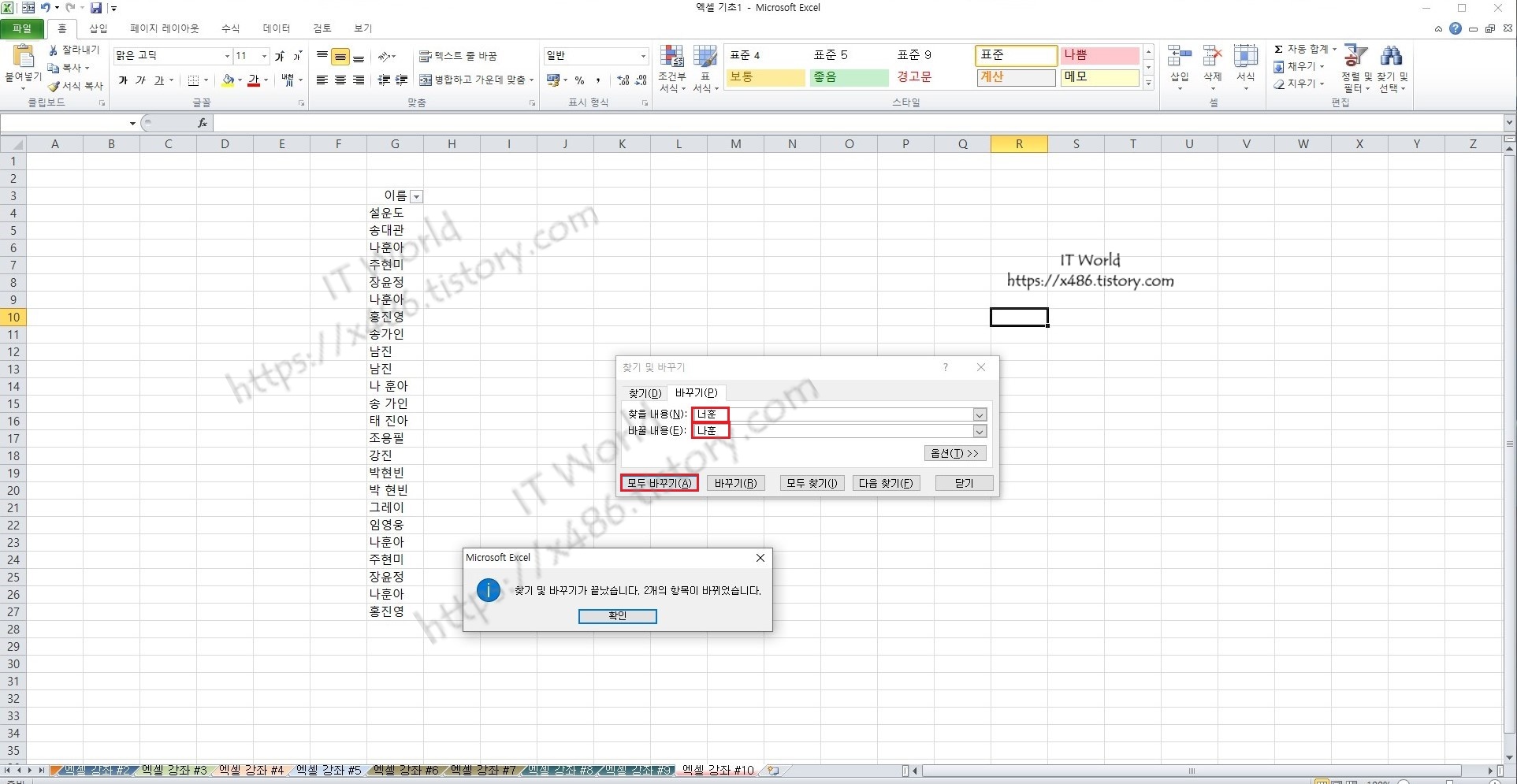 찾을 내용과 바꿀 내용을 적고 모두 바꾸기 버튼 클릭