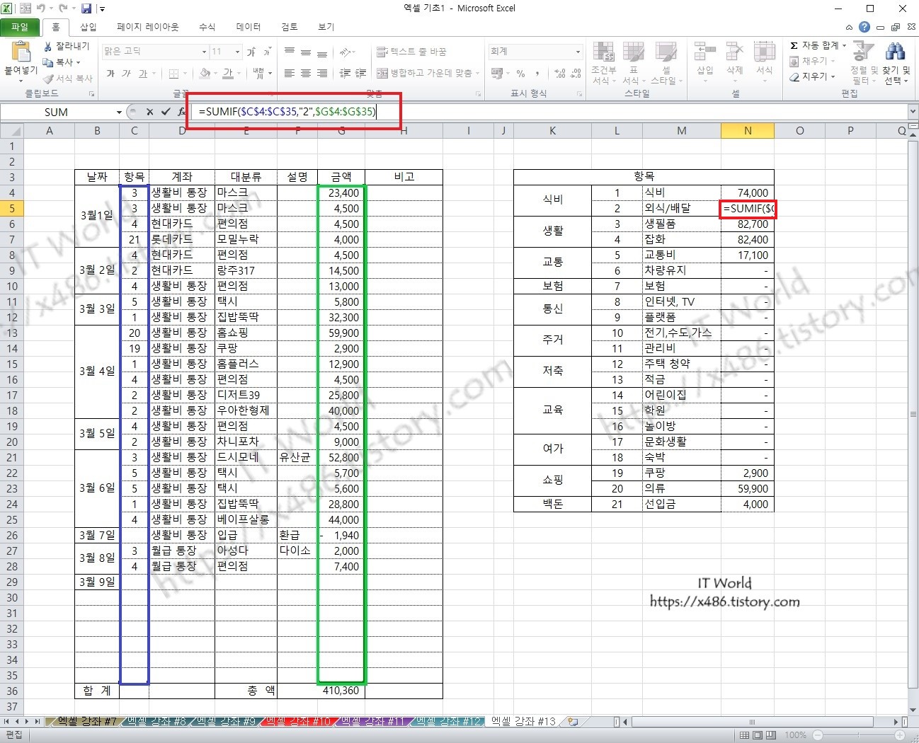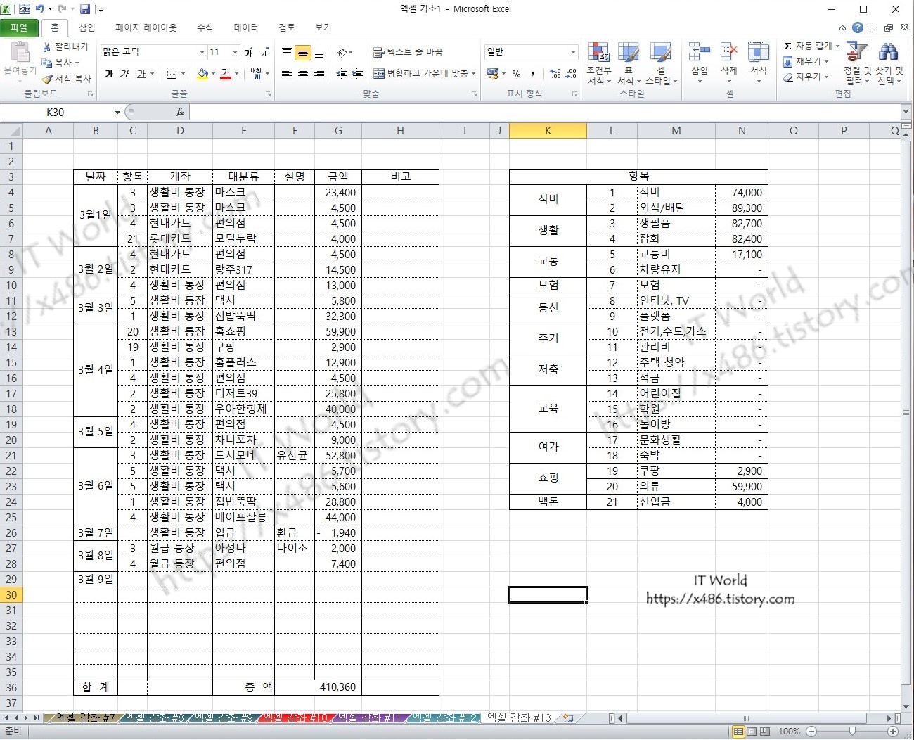 이번 강좌에서 중점이 되는 부분은 항목 별 합계를 표시하여 지출의 구분과 금액를 확인하고