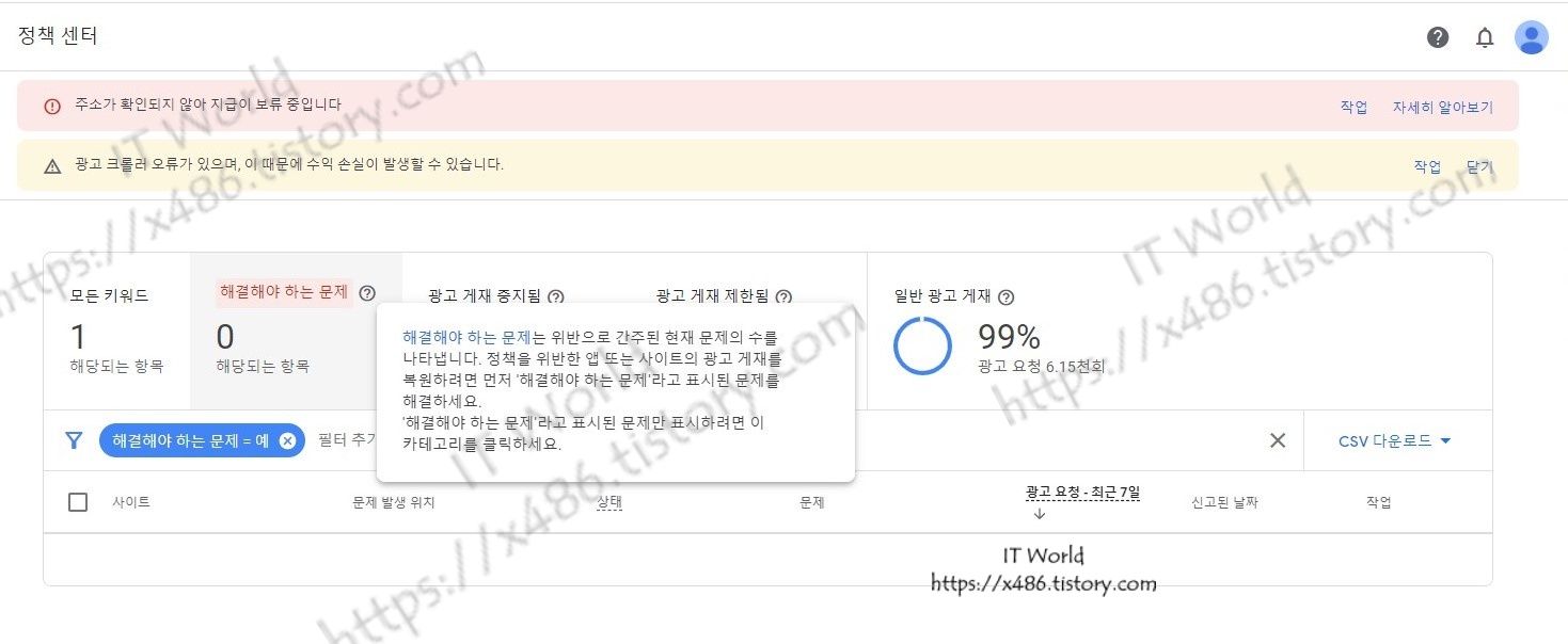 애드센스 광고를 게재하고 얼마 지나지 않아 오류 메시지가 송출되었습니다.
