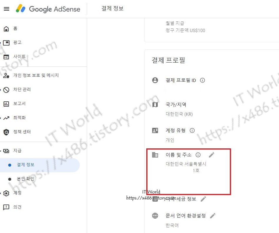 현주소와 등록된 주소가 다를 경우 지급 > 결제 정보 > 설정 관리