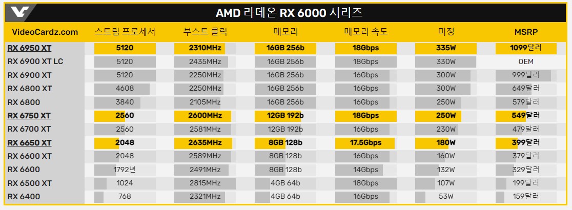 관련 사이트 : https://videocardz.com/newz/amd-radeon-rx-6950xt-to-cost-1099-rx-6750xt-549-rx-6650xt-399